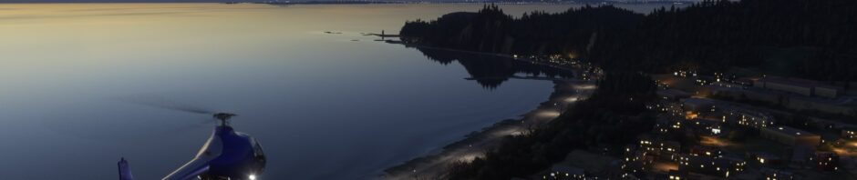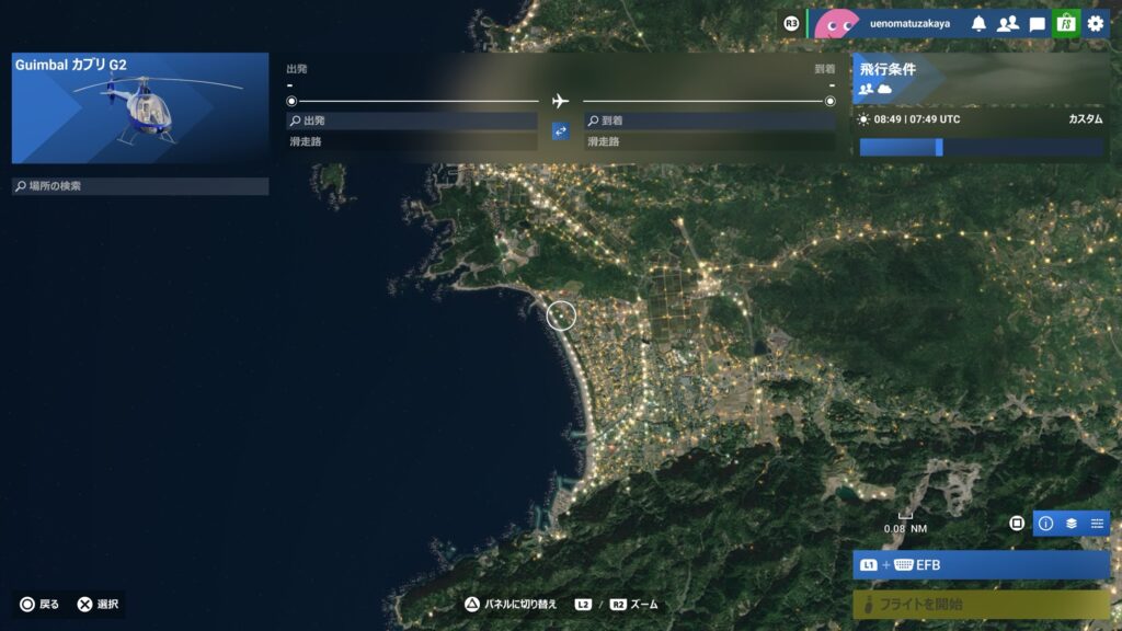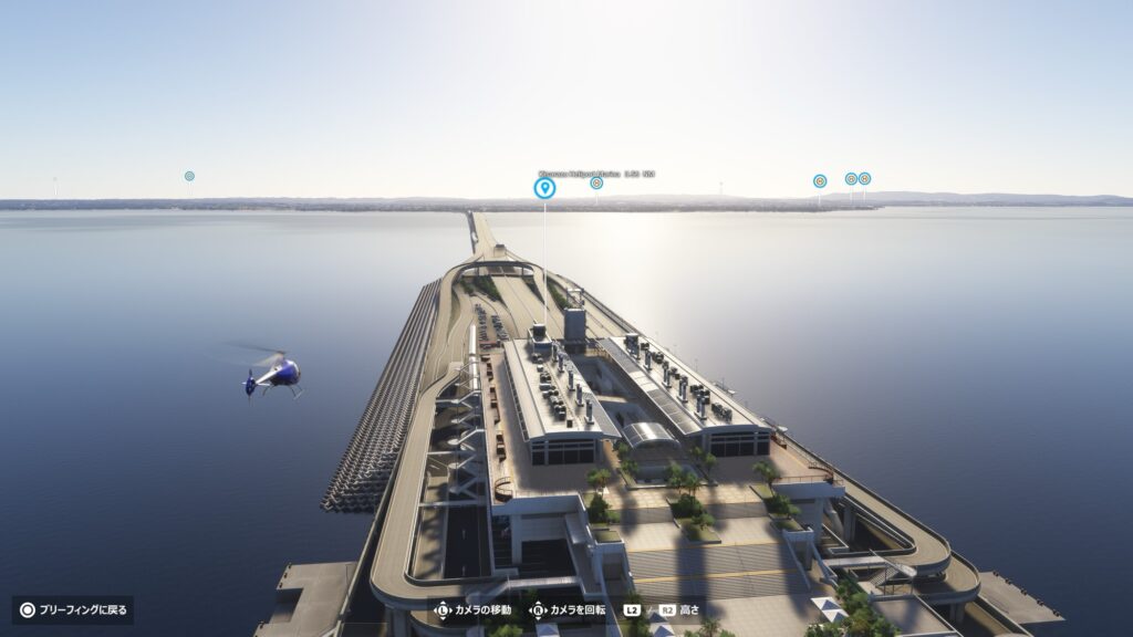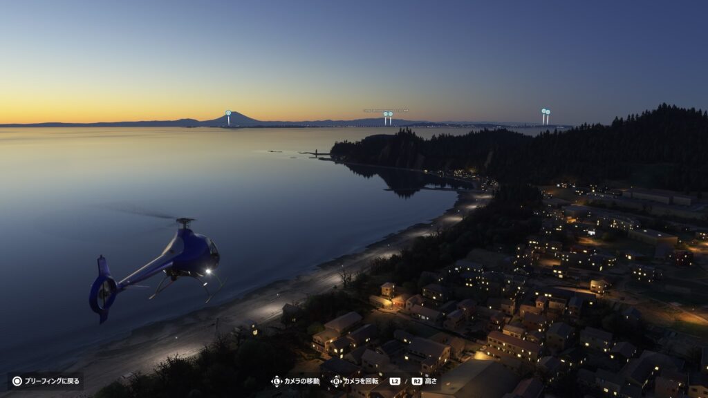 FS2024のヘリコプターで、いつも合宿をやっている岩井海岸まで飛んでみます。