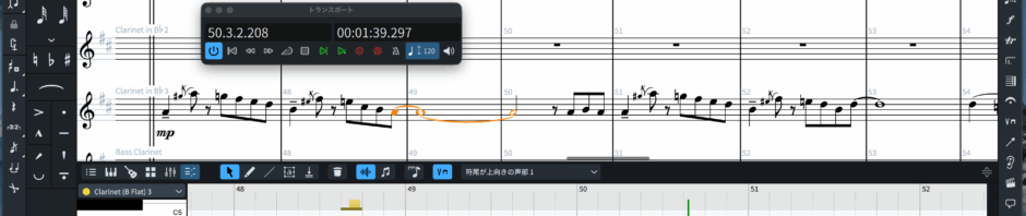 2個の8分音符で、スラーで繋がってスタッカート、みたいな音型では、スタッカートがついている音を少しだけ音量下げる演奏をすることがあります。ピアノロールにべロシティを表示しておけば、狙った音だけちょっと音量下げてやる操作もできます。このあたり、DAWのような使い勝手なんですね。